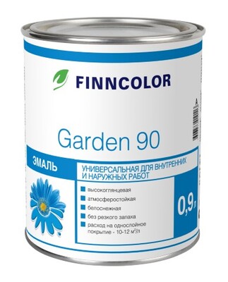 Универсальная глянцевая алкидная эмаль Garden 90 применяется для окраски деревянных, металлических, оштукатуренных, бетонных, зашпатлеванных, кирпичных поверхностей, гипсокартона, ДСП и ДВП внутри и снаружи помещений. Цвет выпускается в базах А и С. Колеруется по каталогам Тиккурила и ТЕКС для интерьеров. Расход 10-12 кв.м/л. в один слой Время высыхания от пыли 3-4 часа, межслойное высыхание 24 часа Степень блеска глянцевая