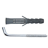 Материал: дюбель - полипропилен; полукольцо – оцинкованная сталь.Комплект состоит из дюбеля и прямого крюка (костыля). Данный комплект предназначен для навешивания легких навесных конструкций таких как зеркала, часы, картины и других на стены из полнотелых строительных материалов (бетон, кирпич, камень). Удобно использовать для крепления изделий, снабженных специальными мебельными подвесами.