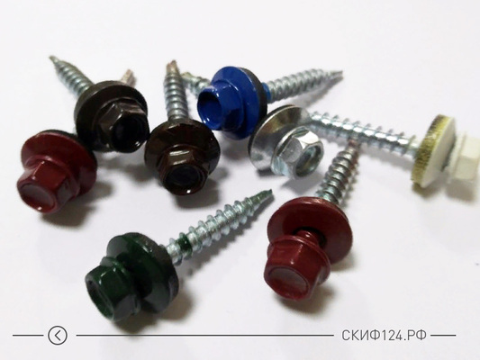 Окрашенные кровельные саморезы используются для монтажа кровельных листов к металлическим или деревянным каркасам на стенах или крышах. Все окрашенные кровельные саморезы продаются в комплекте с шайбой и резиновой прокладкой толщиной 2,8 мм. Шайбы окрашены по цвету шляпки кровельного самореза.
