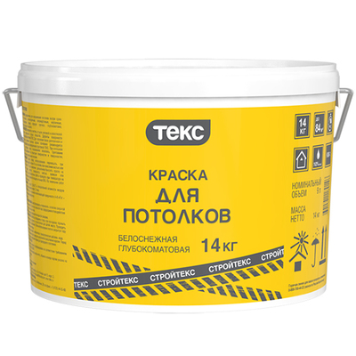 Водно-дисперсионная краска для потолков в сухих помещениях. "СтройТЕКС". Цвет: Белый Тип поверхностей: Предназначена для окрашивания потолков внутри сухих помещений по бетонным, оштукатуренным, гипсокартонным, кирпичным, деревянным поверхностям. Расход:6-8 м2/кг – по ровной невпитывающей поверхности, 4-6 м2/кг – по неровной впитывающей поверхности Время высыхания:1 час, следующий слой наносить через 1,5 часа. Срок годности 18 мес. Колеровка Для придания необходимого оттенка рекомендуется использовать колер краски для водно-дисперсионных красок ТЕКС. Степень блеска:Образует глубокоматовое покрытие, визуально скрывающее мелкие неровности