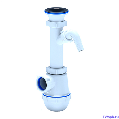 Пластиковый сифон, с отводом для стиральной машины, для мойки со сливным отверстием Ø50 мм, подключение к канализации: Ø40 мм, без гибкой гофрированной трубы, длина винта сливной решётки: 40 мм, материал решётки: нержавеющая сталь.