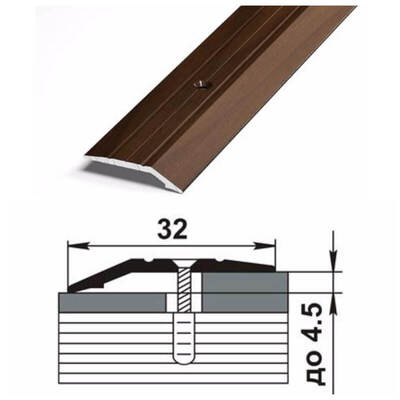 Назначение: Обеспечивают скрытие стыков разных по толщине и находящихся на разных уровнях напольных покрытий. Пороги с отверстиями для монтажа поставляются с саморезами (d 3,0 мм Х 25,0 мм) и дюбелями. Пороги поставляются в индивидуальной упаковке.Используют для ламината, плитки или керамогранита, линолеума или ковролина, или любое другое покрытие, а также на ступени и различные подъемы.